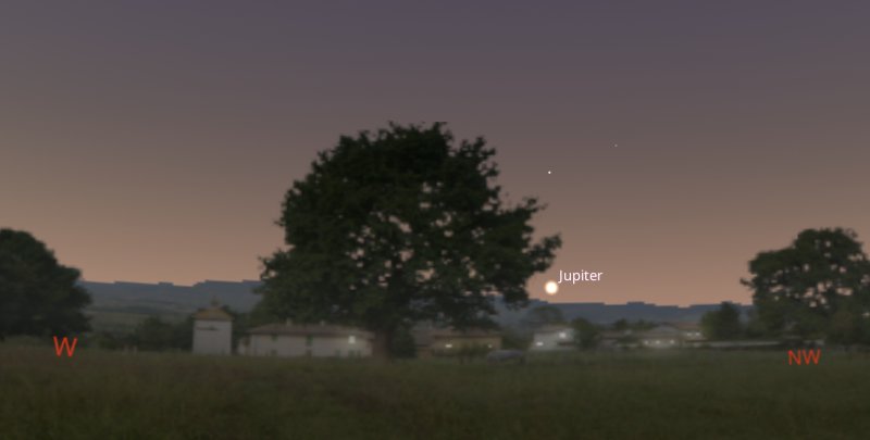 On Tuesday 6th, Io begins to transit Jupiter, very close to its shadow from 2am. Jupiter will be located towards the south west. |