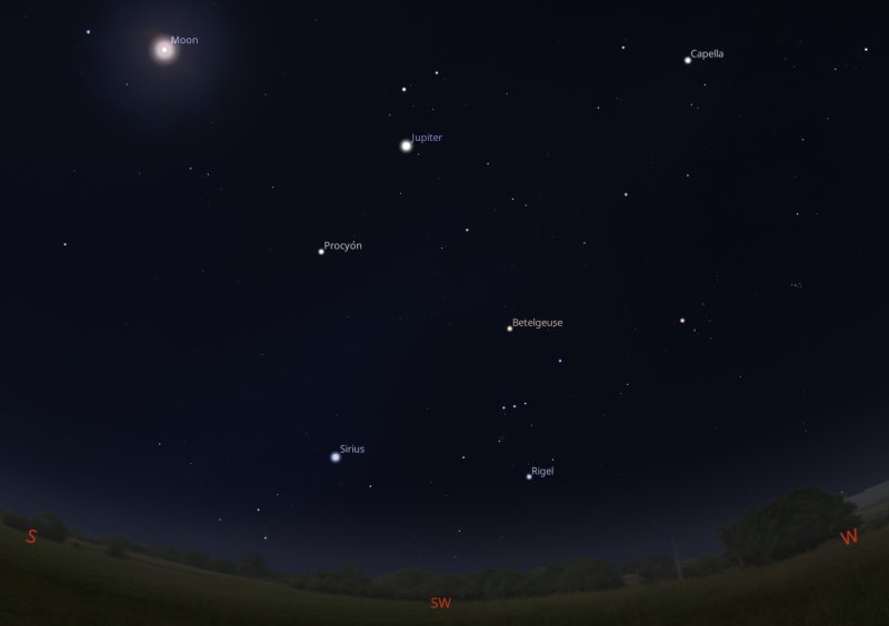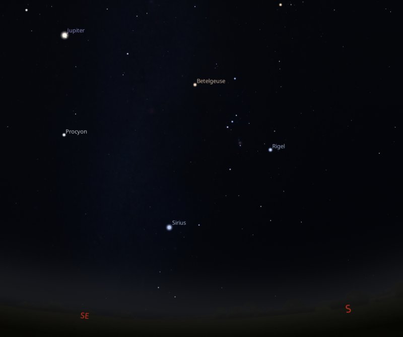 If at the same time, you look to the right of Jupiter and a little below it, you will be able to see the bright star, Procyon and the brightest star in the night sky, Sirius. To the right of them, the constellation of Orion will be easy to find. |