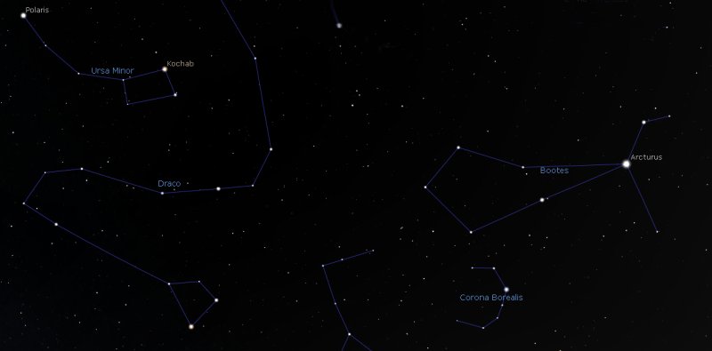 The evening of Thursday 22nd sees the peak of another meteor shower. This time it's the Ursids, that appear to radiate from near the star Kochab in the constellation of Ursa Minor. Any shooting stars you see are debris left by comet Tuttle. Polaris, the pole star, is located at the end of Ursa Minor, so you will be looking due north. |