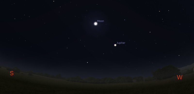 Two days later, on the evening of Wednesday 25th, the Moon will be close to Jupiter if you look south west, again around 6pm. By then the Crescent Moon will be 21%-lit. |