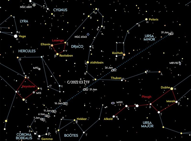 I suggested trying to find comet C/2022 E3 ZTF with your telescope or binoculars on Christmas morning, when it would be located within the constellation of Corona Borealis. It will actually be possible to see the comet throughout the whole of January and as the days go by, it will appear to move from the edge of Corona Borealis towards Ursa Minor and progressively become brighter. |