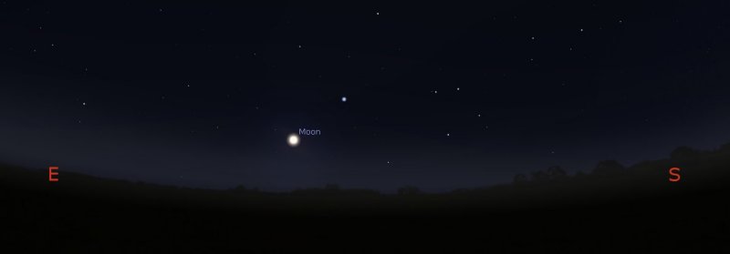 Venture outside at the same time a few days later, on Sunday 26th and the Moon will have become a 44%-lit crescent and it will be located towards the south, very close to the Pleiades open cluster of stars. |