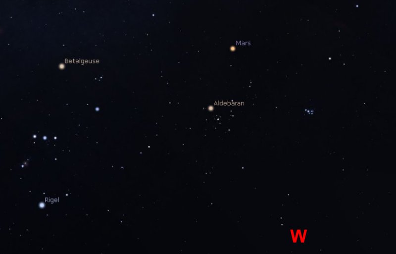 If you venture outside after your Valentine's Day dinner, around 10pm, Aldebaran will be towards the west, halfway between the constellation of Orion and the Pleiades open cluster of stars, a little below planet Mars. |