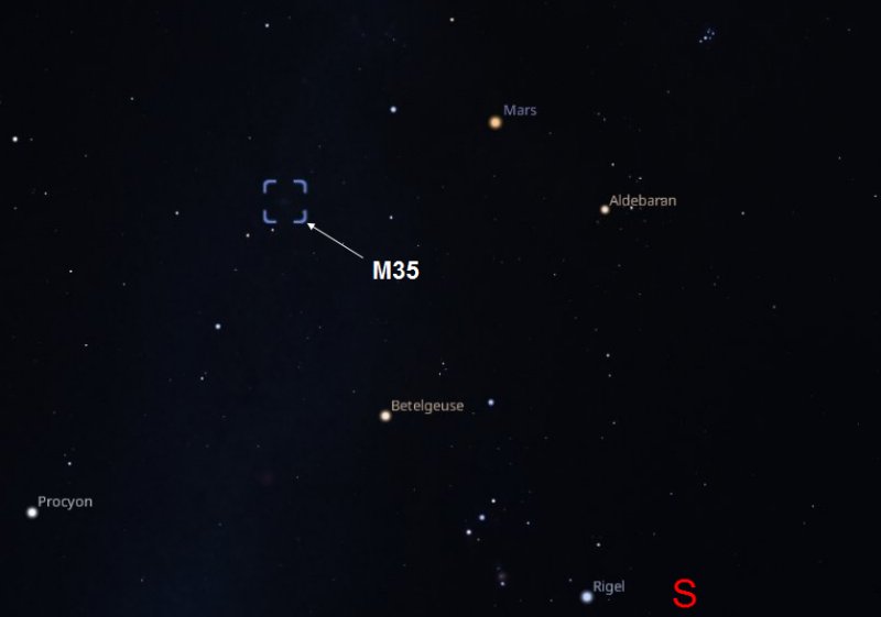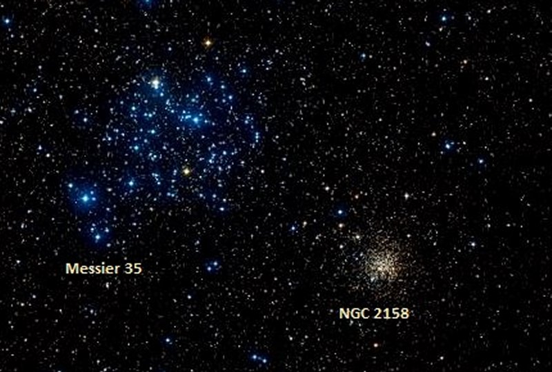 If you are using a telescope, just down and to the right of M35 is another open cluster NGC2158. The two clusters are un-related......M35 is only 3000 light years away, where the much fainter NGC2158 is more like 9000 light years away and 2 billion years old! |