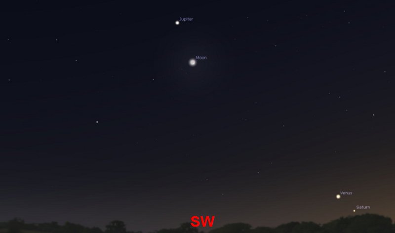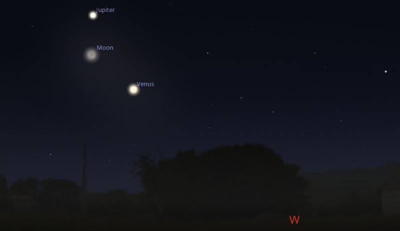 Just after dark on Wednesday 22nd a thin 8%-lit Crescent Moon forms a line with Venus and Jupiter as the trio set towards the west horizon. |
