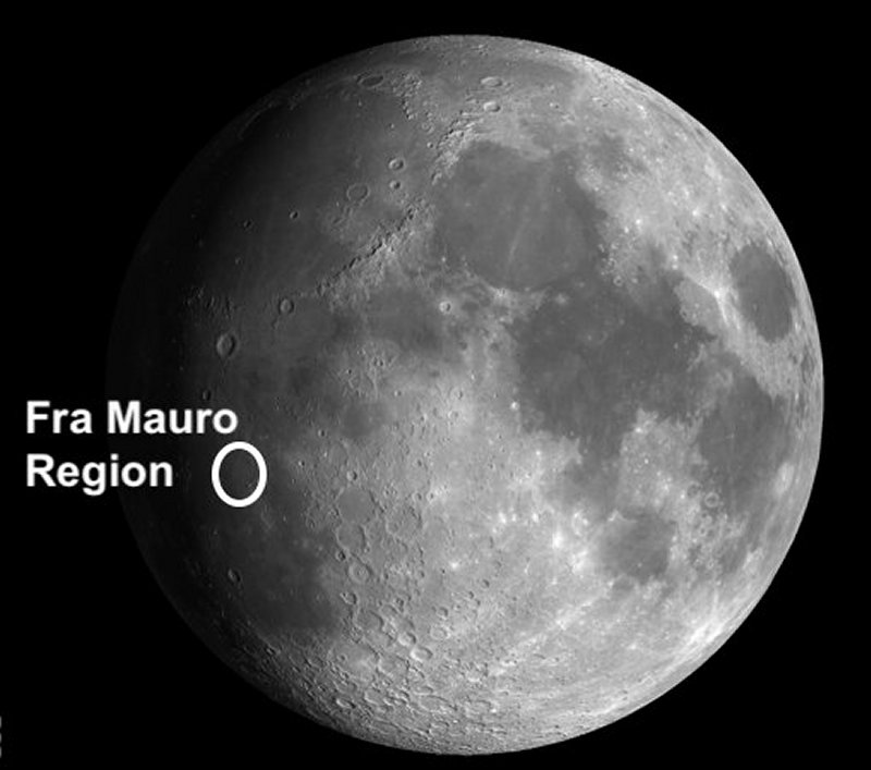 If you imagine the surface of the Moon as a clock face, the Fra Mauro region is towards what would be the 7 o'clock position, a little down and left of centre. |