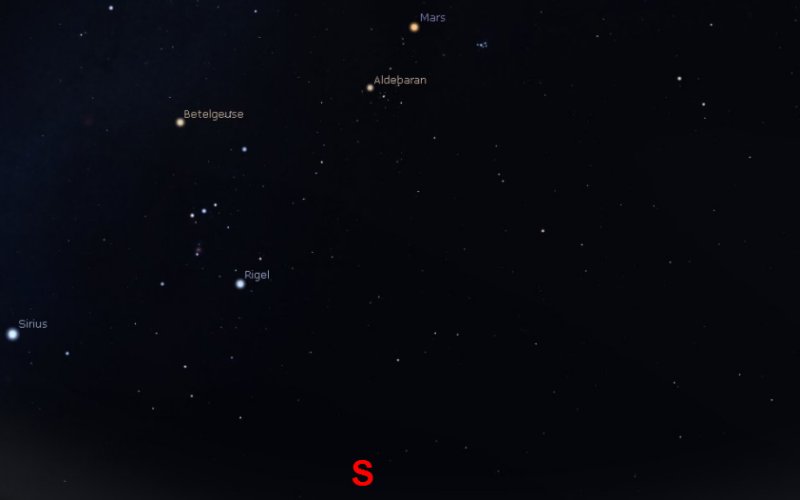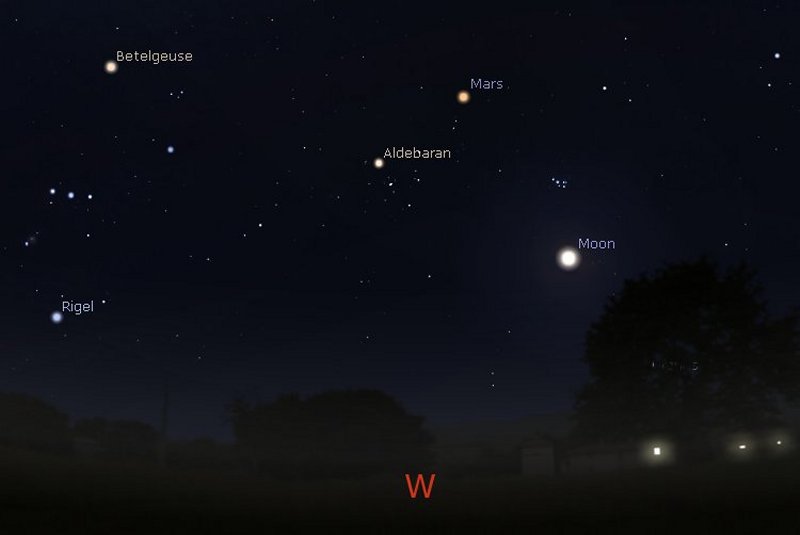 Above and a little to the left of the Pleiades you will find planet Mars shining quite brightly at a magnitude of around -0.3 and to the left of Mars, the bright star Aldebaran in the constellation of Taurus. Further left again is the constellation of Orion with its red giant star Betelgeuse at the top and the much younger and hotter star Rigel towards the bottom. |