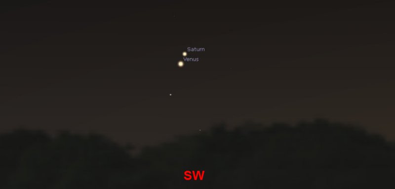 If early mornings are not your thing, then you could go outside at 6pm on Sunday 22nd and look towards the south west horizon. Venus and Saturn will appear to be very close together just before they set. Venus will be the lower of the two pinpoints of light. |