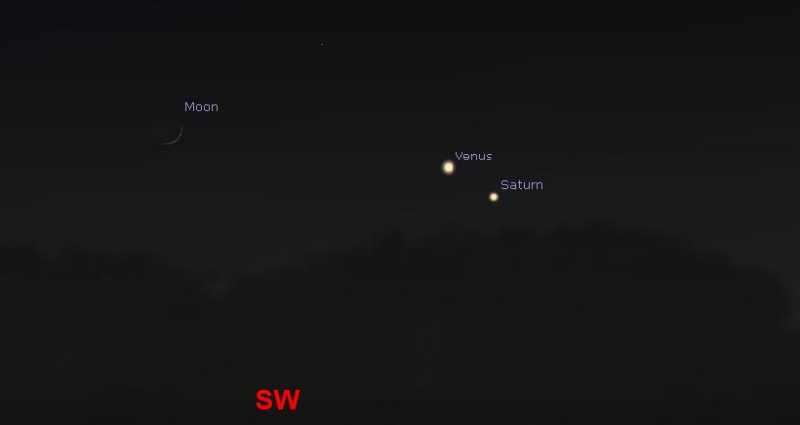 Just after sunset on Monday 23rd, there is an opportunity to see Venus and Saturn close together, just before they set below the horizon. They will be joined by a very thin 5%-lit Crescent Moon to the left of them. Around 6pm, the trio will be located towards the south west. |