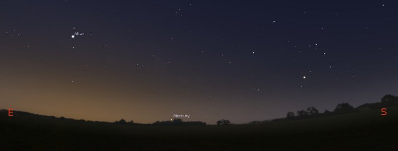 If late night observing isn't your thing and you prefer an early start, at daybreak on Monday 30th, planet Mercury will be at its greatest western elongation or in other words, it's furthest separation (about 25 degrees) from the rising Sun. If you go outside just before 7am, Mercury will be rising above the horizon towards the south east. |