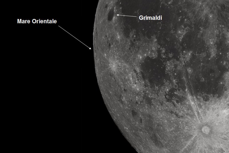 On Wednesday 18th, the western edge of the Moon is slightly more visible and this is a great chance to spot the Mare Orientale. Mare are large dark basaltic plains and early astronomers thought that they were actually seas, hence the Latin name for them. Mare Orientale resembles a large "bullseye" and it is normally hard to see as it's on the edge between the nearside and darkside of the Moon. |