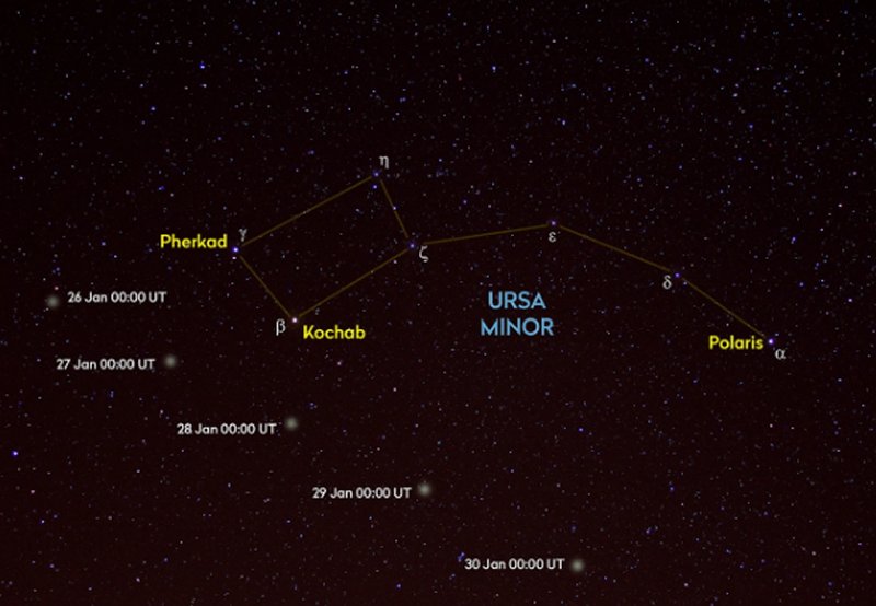 The optimum viewing will be during the night of 27th / 28th January, when the comet will be fairly close to the star Kochab in Ursa Minor and its magnitude will be around +4.8, so potentially even visible with the naked eye from a dark sky location. As a bonus that night, the Moon sets a little after midnight so there will be no light pollution from that source. |