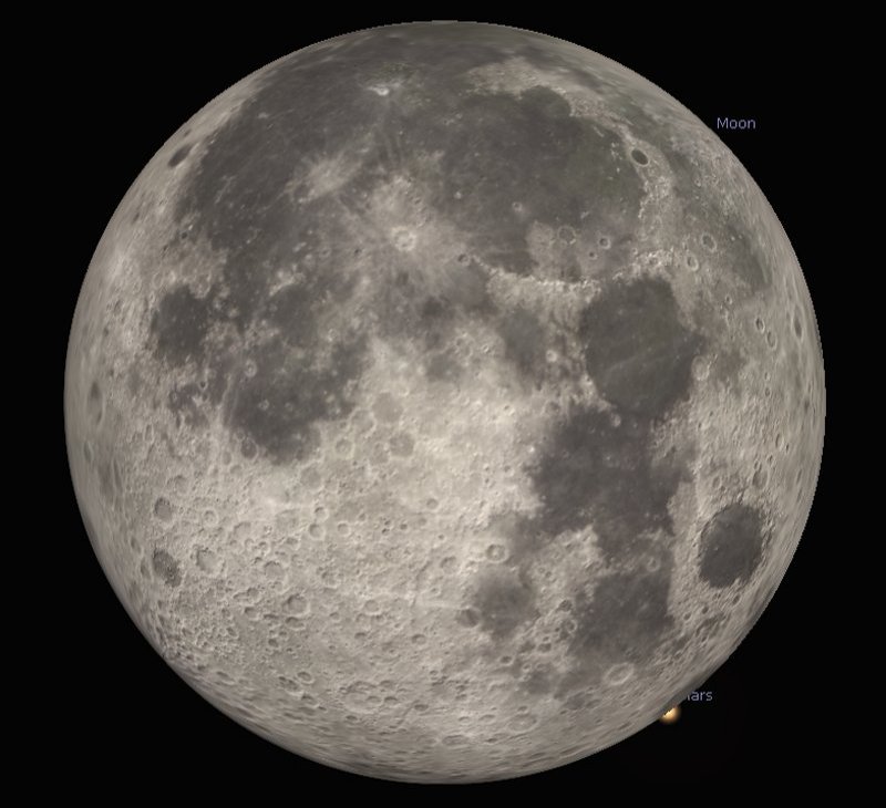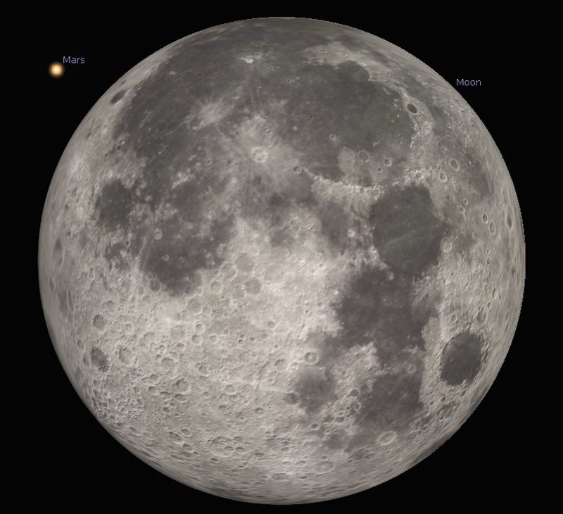 | If you are up early on Thursday 8th around 4.50am and look towards the west, you can catch the Full Moon occulting Mars. The Red Planet will take 37 seconds to disappear behind the north west limb of the Moon at 4.57am and 37 seconds to reappear from behind the south east limb a whole hour later. |