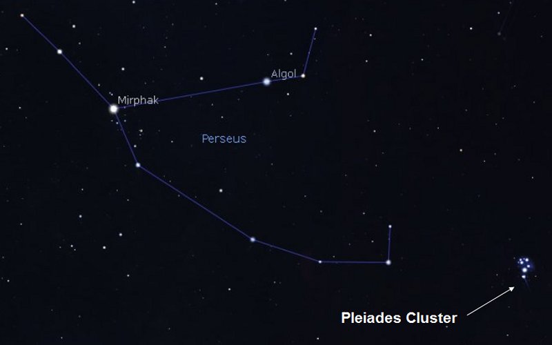 Some stars do vary in brightness though. Look to the left of the Pleiades and find the constellation of Perseus. Then identify the star Algol, also known as the "Demon Star". It is actually an eclipsing binary star system where two stars orbit around each other. The pair normally has a steady magnitude of +2.2, but every 2.86 days it drops to +3.4 as one star appears to pass in front of the other over a period of ten hours. |