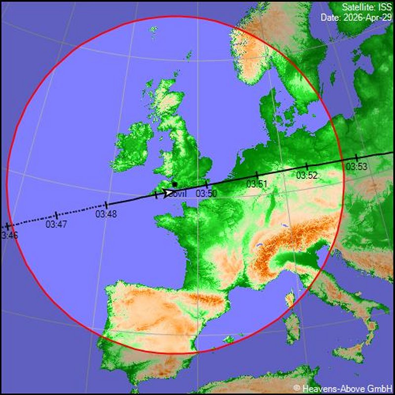 The first pass is on Tuesday 28th April at 4.34am, followed by 3.48am on Wednesday 29th. Or you could try again at 4.37am on Saturday 2nd May. In all three cases, the ISS appears in the west and over a period of about six minutes, passes almost directly overhead, before disappearing towards the east. |