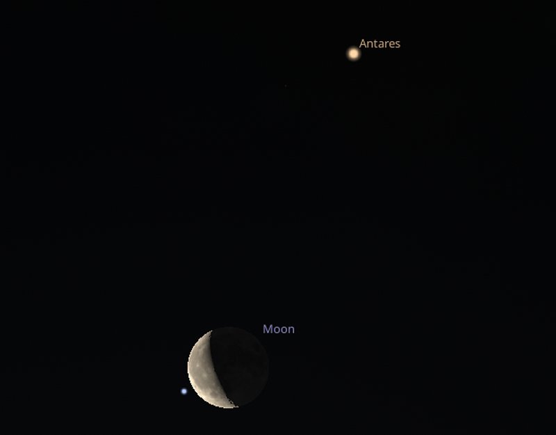 If you would prefer a morning activity, look towards the south at 6am on Wednesday 11th to see a 33%-lit waning crescent Moon occulting (or passing in front of) a magnitude +2.8 star in the constellation of Scorpius. At the same time, the bright red giant star Antares will be visible above the Moon, shining at a magnitude of +1.7 |