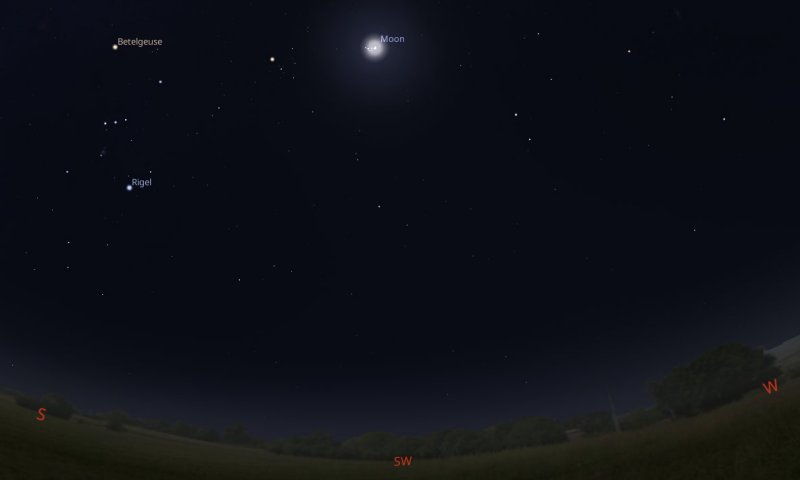 If you look towards the south west at 9pm on the evening of Tuesday 27th, a 68%-lit waxing gibbous Moon will appear to be passing in front of the Pleiades open cluster of stars. To the left of this event, the constellation of Orion with its bright stars Betelgeuse and Rigel will be easy to spot. |