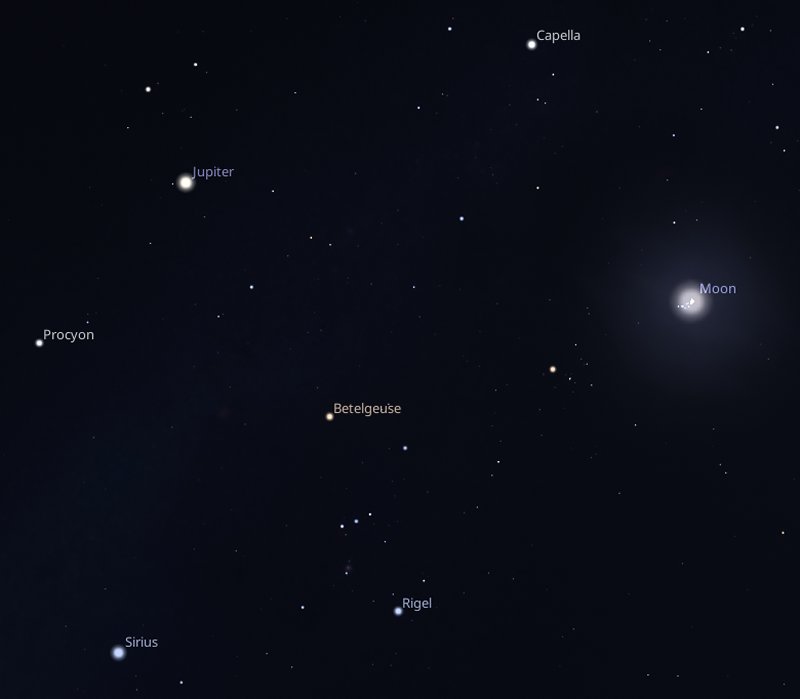 While you are looking in that direction, you can observe several more of the brightest stars in the night sky - Sirius, which is the brightest of all, Procyon and Capella. Even brighter, between Procyon and Capella, you will find Jupiter. |