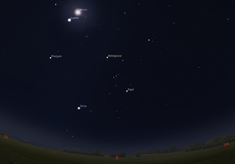 If you venture outside just as it's getting dark on 3rd, say around 5pm, the Moon will have risen above the horizon towards the north east and planet Jupiter will be just below it. As it will be close to the horizon, the Moon will look artificially very large - this is nothing to do with it being at perigee, rather that optical effect known as "Moon illusion" where your brain plays a trick on you when viewing things close to the sky line. |