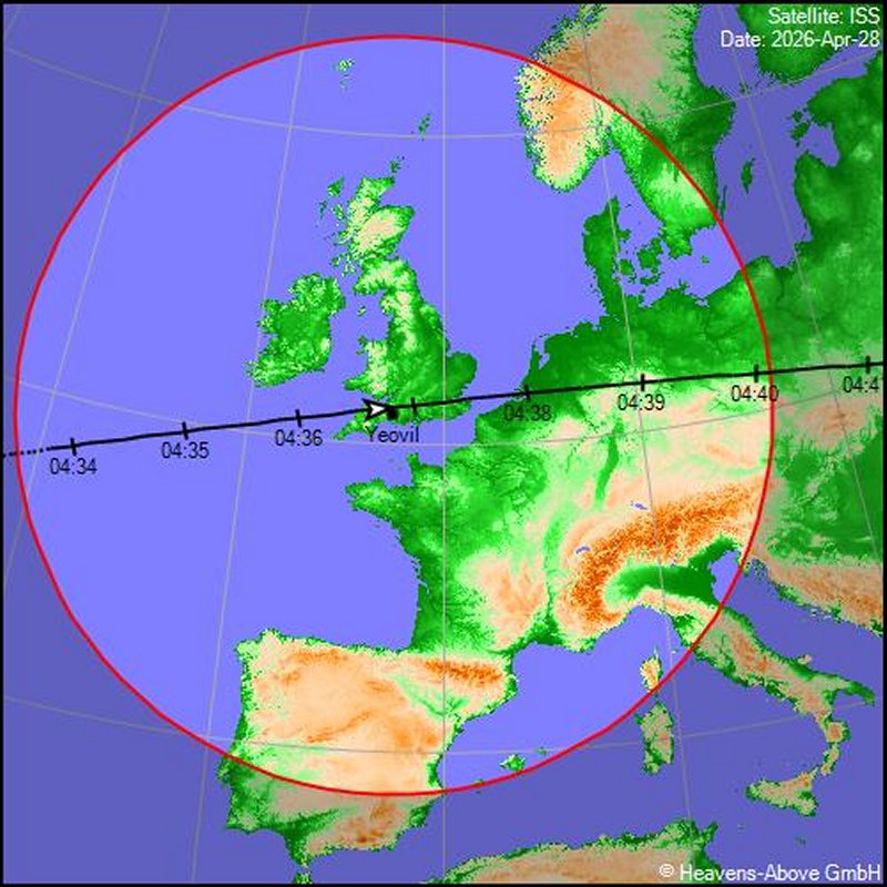 The first pass is on Tuesday 28th April at 4.34am, followed by 3.48am on Wednesday 29th. Or you could try again at 4.37am on Saturday 2nd May. In all three cases, the ISS appears in the west and over a period of about six minutes, passes almost directly overhead, before disappearing towards the east. |