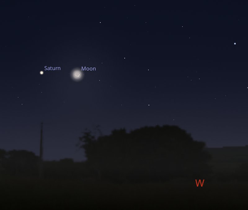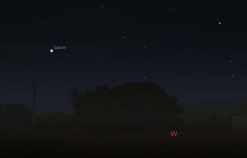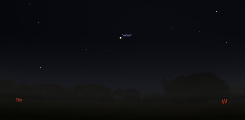 Saturn's tilt now means that you will no longer be able to see its largest moon Titan pass across the planet's surface. If you aim your telescope towards the west south west around 8pm on the evening of Tuesday 10th, Saturn will be about to set below the horizon and you should be able to catch Titan appearing to pass immediately above Saturn's north pole instead. |