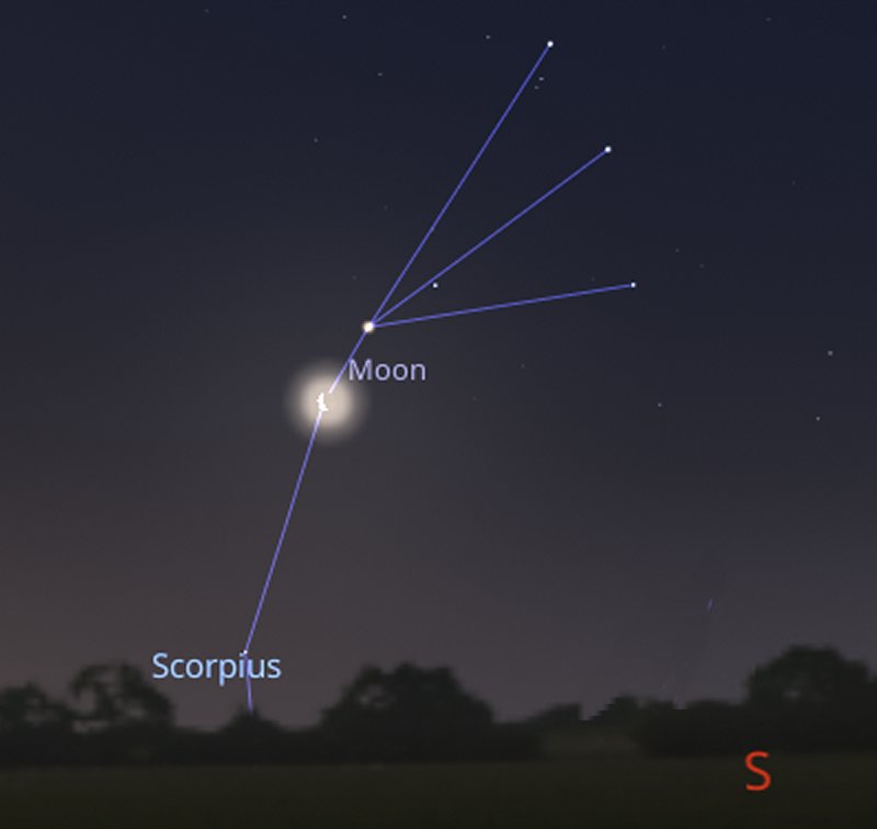 If you would prefer a morning activity, look towards the south at 6am on Wednesday 11th to see a 33%-lit waning crescent Moon occulting (or passing in front of) a magnitude +2.8 star in the constellation of Scorpius. At the same time, the bright red giant star Antares will be visible above the Moon, shining at a magnitude of +1.7 |