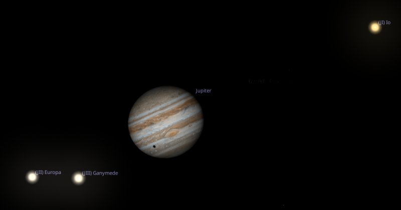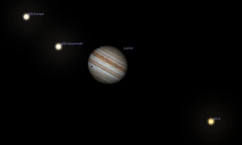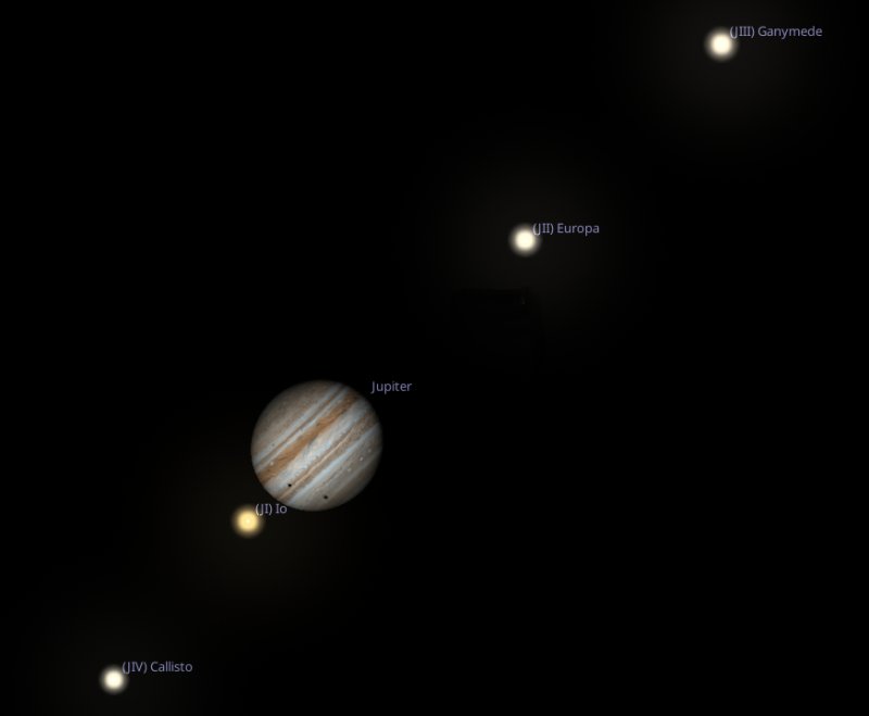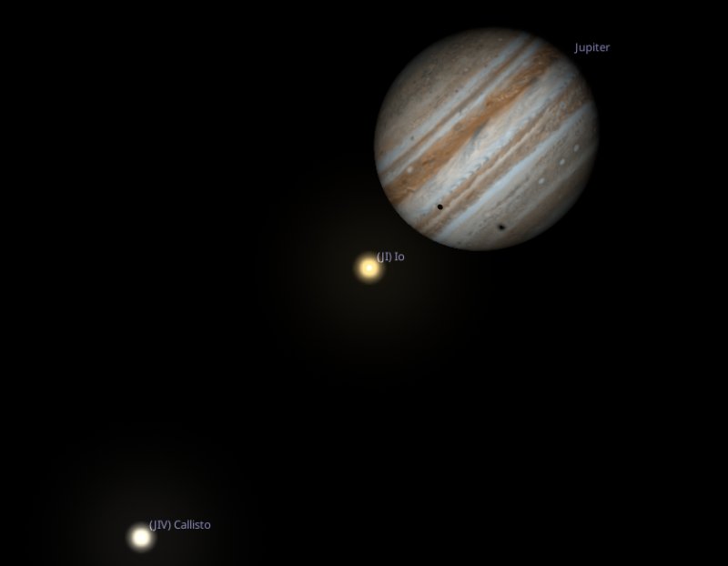 Why have I chosen 6am on the Saturday specifically? Well if you aim your telescope towards Jupiter then, it will be possible to see the shadow cast by two of Jupiter's moons, Io and Europa, at the same time. How cool is that! |