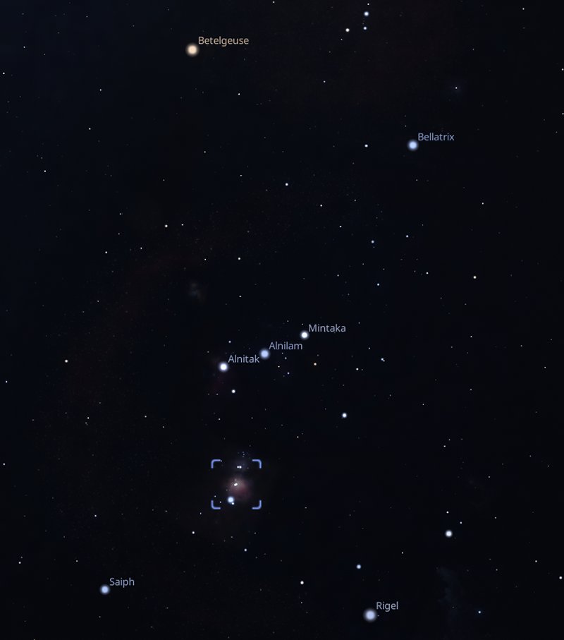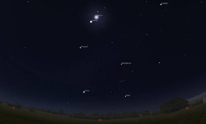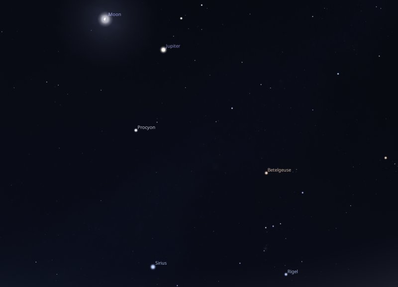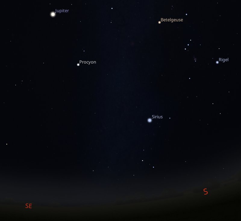 If at the same time, you look to the right of Jupiter and a little below it, you will be able to see the bright star, Procyon and the brightest star in the night sky, Sirius. To the right of them, the constellation of Orion will be easy to find. |