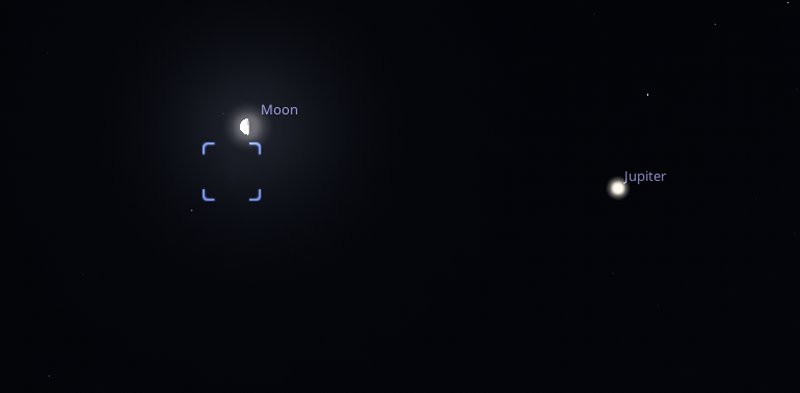 Look towards the south west around 11am on Tuesday morning 16th and try to spot a 28%-lit waning crescent Moon with the naked eye. It will be quite high in the sky - about 55 degrees above the horizon. If you have brought your telescope out, just below and to the left of the Moon, Jupiter will be shining at a magnitude of -1.9 |