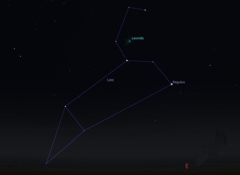 However if you go outside at that time, you won't see a thing, as the constellation of Leo (where the radiant point of the shower is located, near the lion's head) will still be below the horizon. You will need to stay up late, when the constellation appears above the eastern horizon from after midnight on the Tuesday morning. |