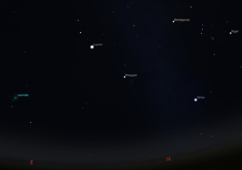 That's close enough to the peak and as a bonus, there will be no light pollution from the Moon, which will still be well-below the horizon. Of course you don't need a telescope to see the spectacle, but if you want to do a bit more exploring, Jupiter will be located a little above and to the right of Leo, with the constellation of Orion further to the right. |