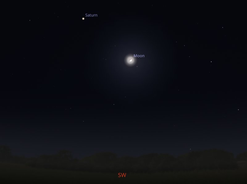 The following evening, Saturday 29th, it should be possible to observe a 65%-lit waxing gibbous Moon close to Saturn if you look towards the south west around 9pm as the pair set below the horizon. |